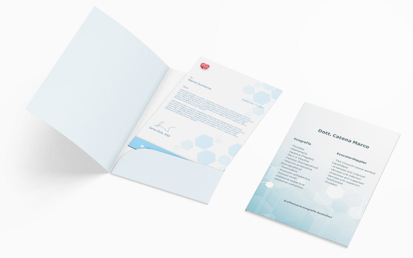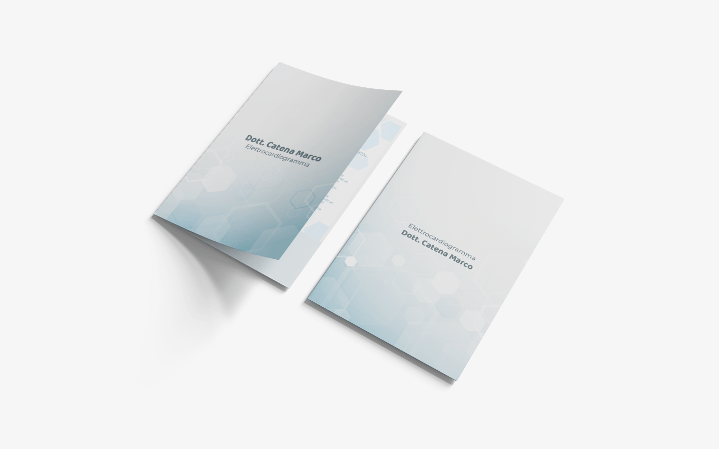 Per il Dott. Catena Marco, medico specialista in ecografie ed esami diagnostici, abbiamo curato la progettazione grafica di due folder porta-documenti coordinati, pensati per accompagnare i referti consegnati ai pazienti. Il primo folder, in formato A4, è dedicato alle prestazioni di ecografia ed ecocolordoppler. L’obiettivo era trasmettere affidabilità, precisione e professionalità: per questo abbiamo scelto uno sfondo pulito, con geometrie esagonali sfumate in toni azzurri, che evocano il mondo medico e tecnologico senza risultare freddi o impersonali. I testi, ben organizzati, presentano in modo chiaro tutte le tipologie di esami disponibili, mentre una leggera sfumatura accompagna visivamente l’apertura della cartellina, guidando lo sguardo verso i contenuti. Il secondo folder, in formato A5, è stato progettato per l’area cardiologica e l’elettrocardiogramma (ECG). Più compatto ma perfettamente coordinato nel design, mantiene lo stesso stile visivo, creando un’identità visiva coerente e riconoscibile.